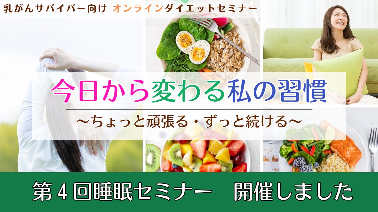 - 【開催報告】寝るだけで月1kgの脂肪燃焼!?乳がんサバイバーのための「睡眠×ダイエット」オンラインセミナー「今日から変わる私の習慣」開催レポート
