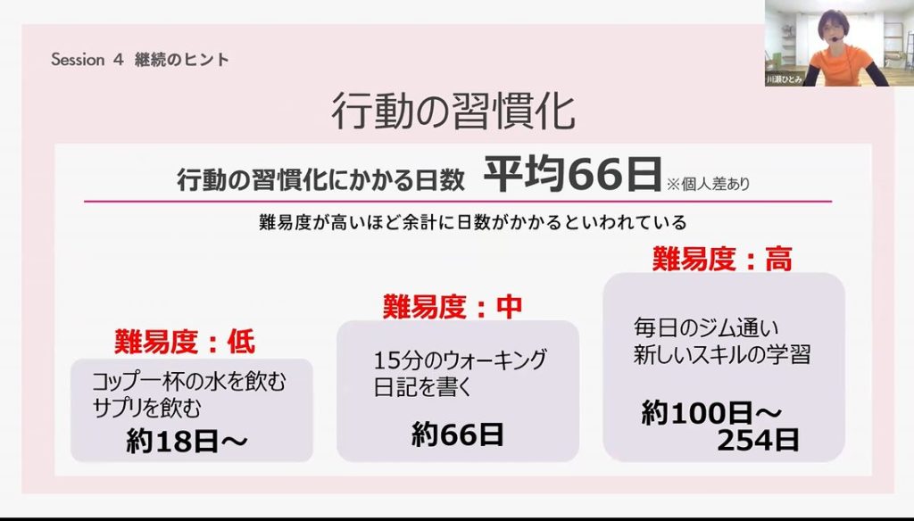 最後に、ここまで学んできたことをどう生活に取り入れ習慣化するかというお話をしました。