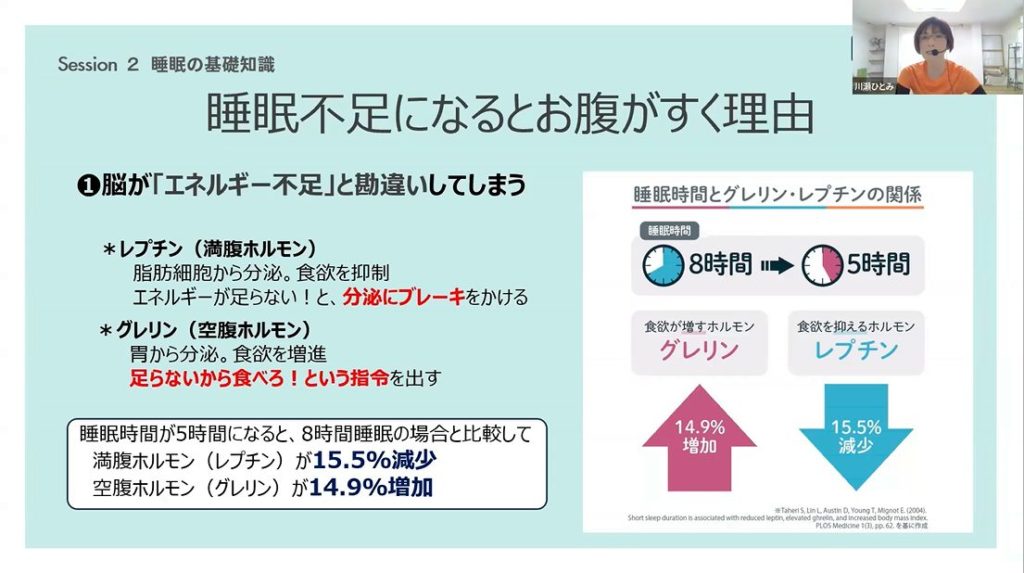 セミナーの冒頭では、まず睡眠と食欲の驚くべき関係についてお話ししました。